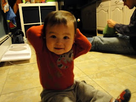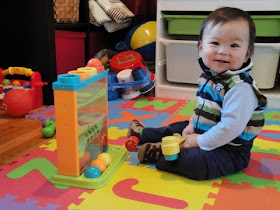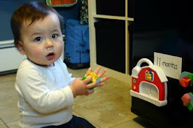 The other phrase he now gets is "arm in.... other arm in". Every time I put a shirt or jacket on him, I'll say "arm in", as I push his arm through his first sleeve, and then "other arm in", for the next. The neat thing is that Griff will often be holding a toy or his Lovie, and he knows to pass it from one hand to the other, so that he can fit his arm through without dropping his precious goods. Sometimes he will even initiate putting his second arm up before I prompt him to. It's so cool how fast these little guys learn, but it's also a sad reminder of just how fast he's growing up.