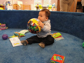 Griffin has adopted his version of a "WeeWee". Est 2010, I call it Griffin's "Lovie"; it is a baby blue stuffed dog head attached to a swirly soft blanket, backed with satin, made by Blankets & Beyond. I found it at Marshalls for $6.99 and had the foresight to purchase 2; 1 goes to daycare and gets trashed/washed, while 1 stays home. Griffin absolutely lights up when he sees it, cries in despair when I try to take it away, and he snuggles with it every night. Since his latest transition to daycare, he has become especially attached to it, as Lovie is loyally performing his duties as a true "security blanket". Since Griff's gotten so addicted, I've bought 2 more off Ebay (at 3x the price-oops), and have also scoured every Marshalls and TJ Maxxs within a 20 mile radius. I felt like I won the lottery this past weekend when I found 3 more at the Marshalls in Niskayuna (two identical ones and third a white bear head version). I think I've purchased 7 in total. Some would call that ridiculous, but I call it sheer genius! :) Griffin will love me one day if he tragically loses his beloved Lovie, and I'll be a hero when I magically whip out a new one (or six) for him.