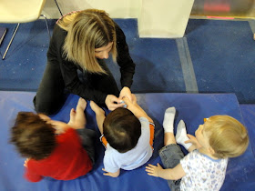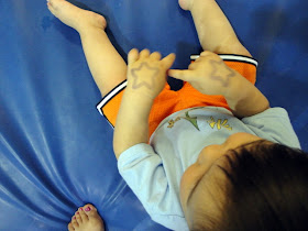 At the end of class, Coach Amanda gives the kids stamps on their hands.  As soon as Griffin hears "it's stamp time", he stops whatever he's doing and hurries over to sit down on the edge of the mat.  He tries to muscle his way through the other kids to sit as close to the teacher as possible to get his stamp first.. he's like a little hungry beggar...