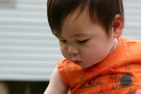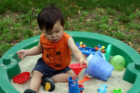 Griffin inherited a turtle shaped sandbox from the Milners (thank you!), and he loves playing in our backyard; he scoops sand into cups, funnels, buckets, and his mouth.