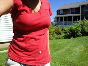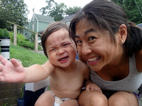 We had a new first yesterday: In the middle of trying to multitask (unsuccessfully), I took Griff's diaper overly soggy diaper off and let him run around inside. (He had been playing in his baby pool, so his diaper was drooping so far down between his legs that you couldn't help but feel bad for the 2 little velcro straps holding on for dear life...) I had my hands tied with dishes, filling ice cube trays with chicken noodle soup, and cutting up tomatoes for a pasta salad, when I glanced behind me and saw new puddle on the dining room floor I had just cleaned up. Of course. In the not even 2 minutes I let Griff run free, he peed on the floor. The warm puddle barely phased me, but to add to the fun while I was cleaning that up, I found what I thought was a little piece of "meatball" (a thumb nail sized cut up piece of Jones all natural honey maple sausage link, the new form of protein that Griff will actually tolerate)... As you may have guessed, it was NOT a "meatball", though maybe it could have been at one point in time... What was even more funny/nasty, I found a surprise ball of poop (dry/hard, not runny thank God) on the 6 inch wide strip of hardwood floor in the living room, spaced perfectly between our rug and Griff's foam play mat. Instead of laughing at the situation and taking pictures for the blog as per my usual process, I had a little too much going on, and I panicked and screamed "Tooooommmmmm!!!!!!", so sorry there are no pictures! :)