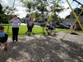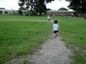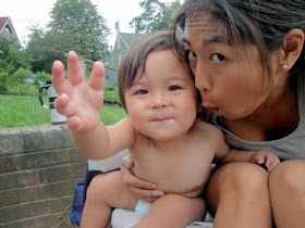Today was a great day. Other than Griffin whining A LOT in his high chair ("all done, all done, alllll donnnnnne!!") and throwing most of his breakfast and lunch on the floor, (P.S. Griffin's personal chef/slave, oh that's right, that's me, made a giant batch of cinnamon raisin french toast for bfast- 1/5 of of a slice made it into his mouth. I made 2 types of sandwiches for lunch- grilled cheese and canadian bacon on mini croissants, and almond butter and strawberry jam on multigrain english muffins- what's not to like?), we spent almost the entire day outside playing and soaking up the summer sun. Our day was filled with visits to 2 playgrounds, a long walk into town for coffee, driveway playtime, an afternoon playground playdate with his Stroud kid buddies, dinner outside with Greta/Charlie/Annika, leftover birthday cake for dessert, and a super long 2.5 hour nap (for Griffin, not me) somewhere in between all that fun.