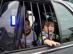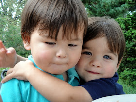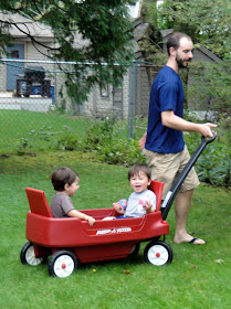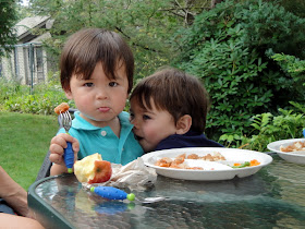 We had a great weekend. Megan and Ryan flew up here from Philly for a wedding (sans Johnny!). It was a super quick trip, but it was awesome to get to hang out a little bit. Two of our three amigos (Charlie and Griffin) had a few wild rides in Martha's ("Ma-Sa") parents' backyard in the Radio Flyer, and they took a fieldtrip up the street to visit the plastic "flamingos" in a neighbor's yard (another new word for Griff). Charlie gets the award for best hugger ever, as he has the hilariously cute tendency to hug and linger...The boys shared the cutest minute long hug ever during their lunch together. Speaking of sharing, Griffin has a loonnnng way to go on this skill. While in the wagon the boys were eating graham bunnies out of the cup holders, and when they got down to 5 remaining bunnies, Griff took one and ate it, then Charlie took one and ate it, and then Griffin saw that there were 3 left, so he snagged them up in a big handful and quickly shoved them into his mouth. Classic Griffin...