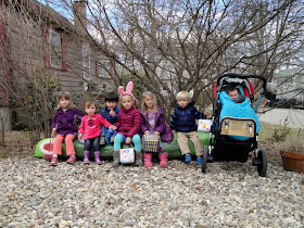 Today was the 2nd annual Willow Road Easter Egg hunt (we were in Albany last year so we missed the inagural one). The weather felt like spring; it was sunny and over 50 degrees. The cluster of kids hunted in 3 yards- Jen's (Maya, Adam & Serena's), Annika's, and then at the other Jen's (Chloe and Mazy's). There were a total of 17 of them (12 from the neighborhood, plus 2 randoms, and 3 cousins). It's really amazing how our street is bustling with kids now- definitely something in the water. We had a post hunt picnic-style pot luck lunch on the Nyberg's back patio.. complete with the full gamut of delicious kid-friendly foods: Vesuvius pizza, yogurt, PB&J, booty, popcorn, fruit salad, veggie sticks...