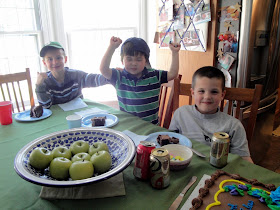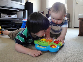 It must be the studious Asian in me coming out... I feel so responsible for Griffin's educational development (of course I should, I'm his mom!), and I'm always a little worried that I'm not working with him enough at home, especially now that my time is divided between he and Vera. This morning I dusted off a few workbooks that I snatched from Target's dollar section ages ago and encouraged him to do a few pages. We spent about 10 minutes on super basic math concepts, coloring, and the letter "A". He earned 2 stickers that he stuck to his shirt- a dino and a basketball.