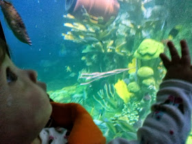 We did it!  Gpa Victor and I successfully made it to the Aquarium and back today with the kids.  A few of the highlights: Vera's expression seeing her first sea lions (the ones in the outside tank by the ticket booths), Griffin with Gpa watching the penguins (reminded me of my parents taking my brother and I to the same aquarium when we were little), learning about the Skate fish (cousin of the sting ray but sans stinger), watching Myrtle the giant 85 yr old, 530 lb sea turtle eat her lunch (she ate protein gels, shrimp, fish, brussel sprouts, lettuce, and broccoli), not seeing any sharks in the main tank (all Griff wanted to see was the sharks, but they are temporarily out while they treat the water for parasites), but then seeing a picture of a great white on the side of a beverage machine outside the aquarium and Griffin thinking it was "soooo amazing", Griffin saying that a green piece of coral looked like a giant mint chocolate ice cream (it did!), and Griffin saying "that's ahhhhmazing" every time a huge fish went by in the big tank (Vera would get excited too and growl).  What was Griffin's favorite thing he saw at the Aquarium? ("the scuba divers").- classic Griffin.